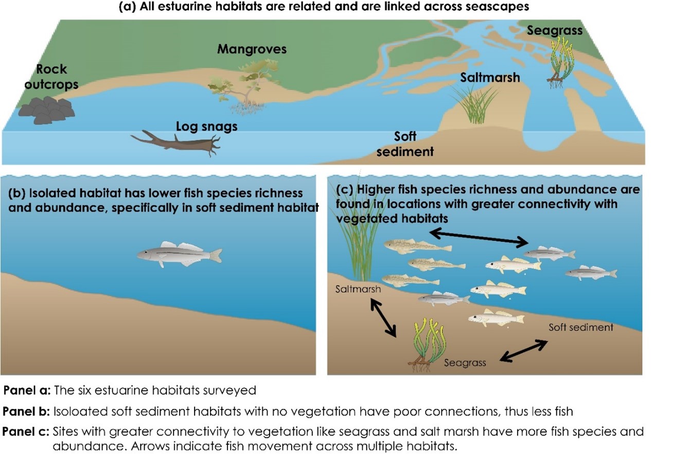 - Greater connectivity with the estuary mouth and mangroves tend to be the most important variables driving higher fish abundance in estuaries. Dissolved oxygen and chlorophyll a concentration are also significant contributors.